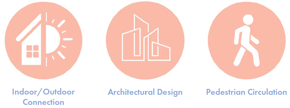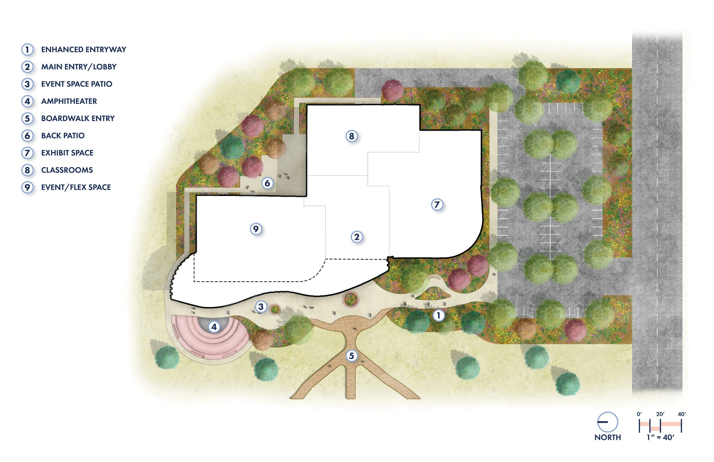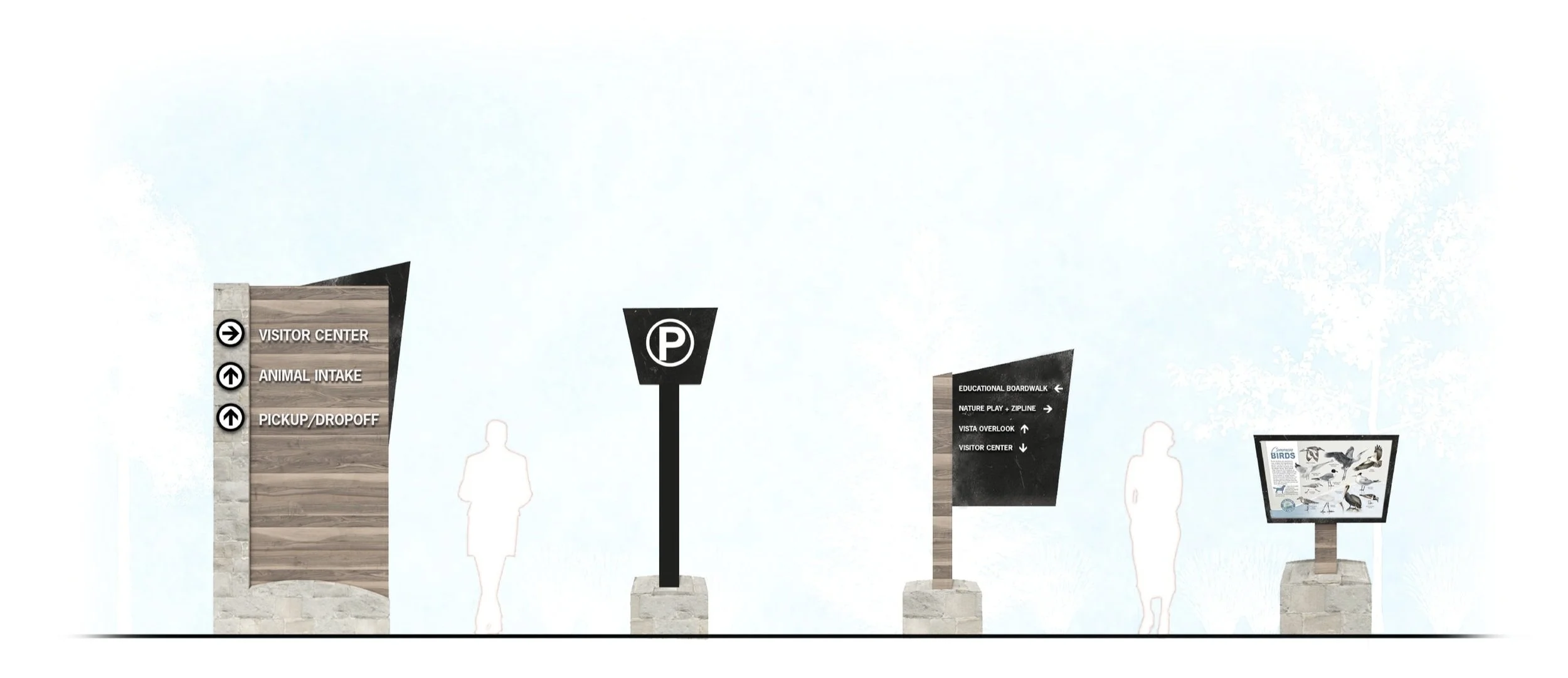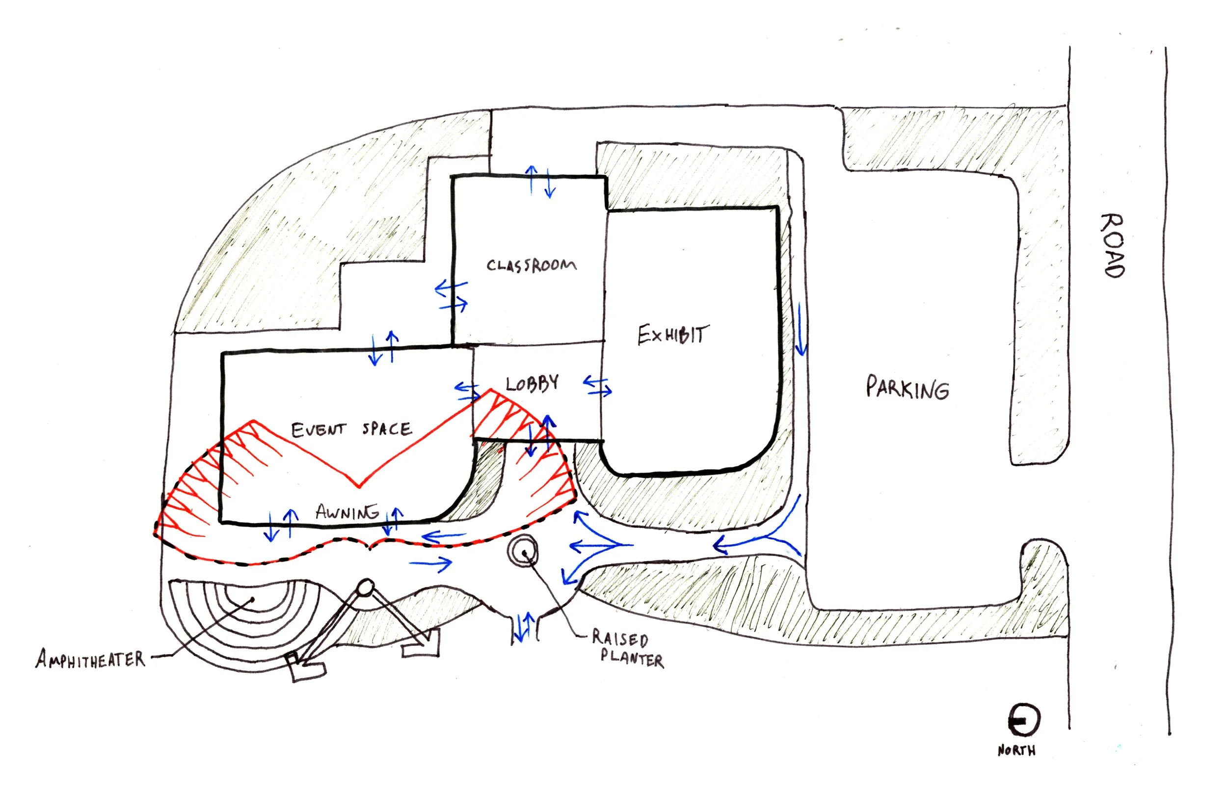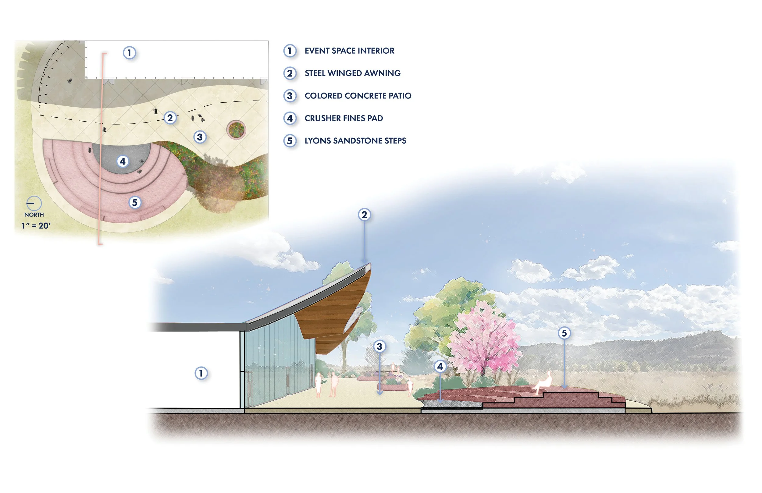I designed the building itself, taking inspiration from the form of hawk wings for the roof. I designed the space for smooth pedestrian circulation, with a particular emphasis on creating a clear arrival sequence. Connections between the indoor and outdoors spaces was important. Fluidity between the main event/gathering space and the front and back patios was a focus, driving considerations of materiality, scale, sun exposure, and viewsheds. A modern aesthetic both in form and materiality serves to make the building focal and attract the eye. Views of the building from a nearby hiking trail ~300’ higher in elevation were studied.